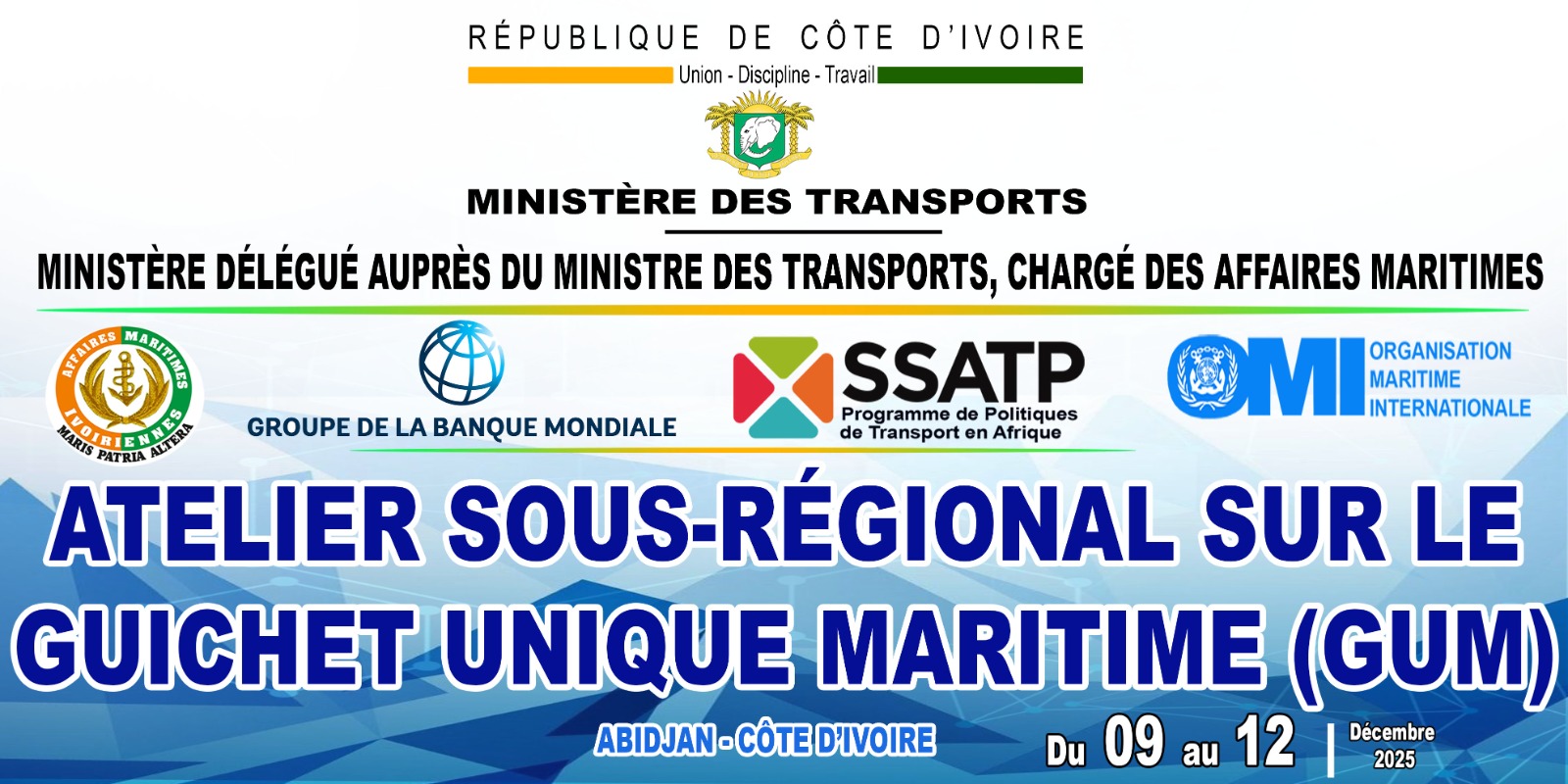 L’Organisation maritime internationale (OMI), le Programme de politiques de transport en Afrique (SSATP) et la Banque mondiale, en collaboration avec le Ministère des Transports de la Côte d’Ivoire, organisent un atelier sous-régional à Abidjan, en Côte d’Ivoire, du 9 au 12 décembre 2025, afin de faire progresser la mise en œuvre du Guichet unique maritime (GUM) dans 12 pays africains francophones.