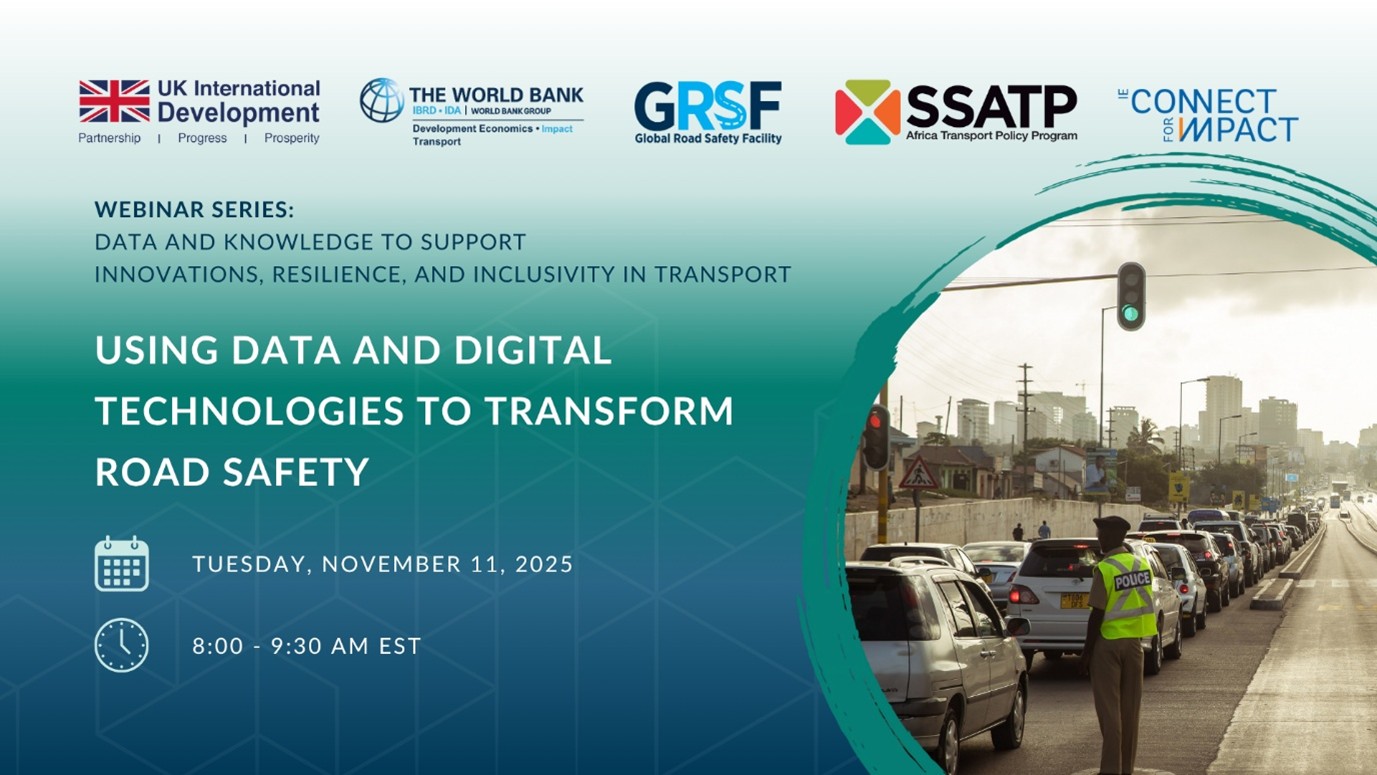 As the World Day of Remembrance for Road Traffic Victims approaches, this webinar will explore how data and digital innovation can help countries design safer, more resilient, and more inclusive road systems. Hosted under the series “Data and Knowledge to Support Innovations, Resilience, and Inclusivity in Transport,” this session will bring together experts from the World Bank’s ieConnect for Impact program, the Global Road Safety Facility (GRSF), and the Africa Transport Policy Program (SSATP) to discuss how evidence-based data and digital technologies can inform and transform road safety policies in resource-constrained settings.